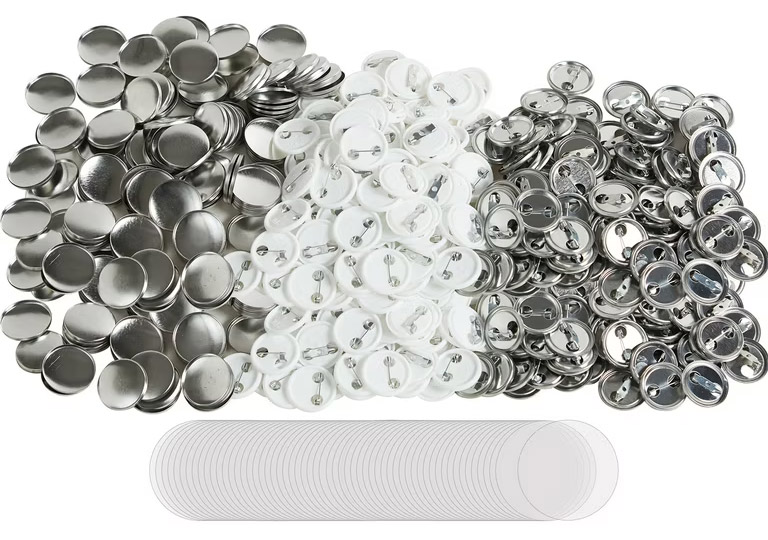 Each printed design is cut into perfect circles, then layered with a clear protective film to prevent fading or scratching. The image, film, metal shell, and back pin are placed into a badge press, which locks them together securely. If you’re ordering magnet backs or keyring-style badges, the components are adjusted accordingly.